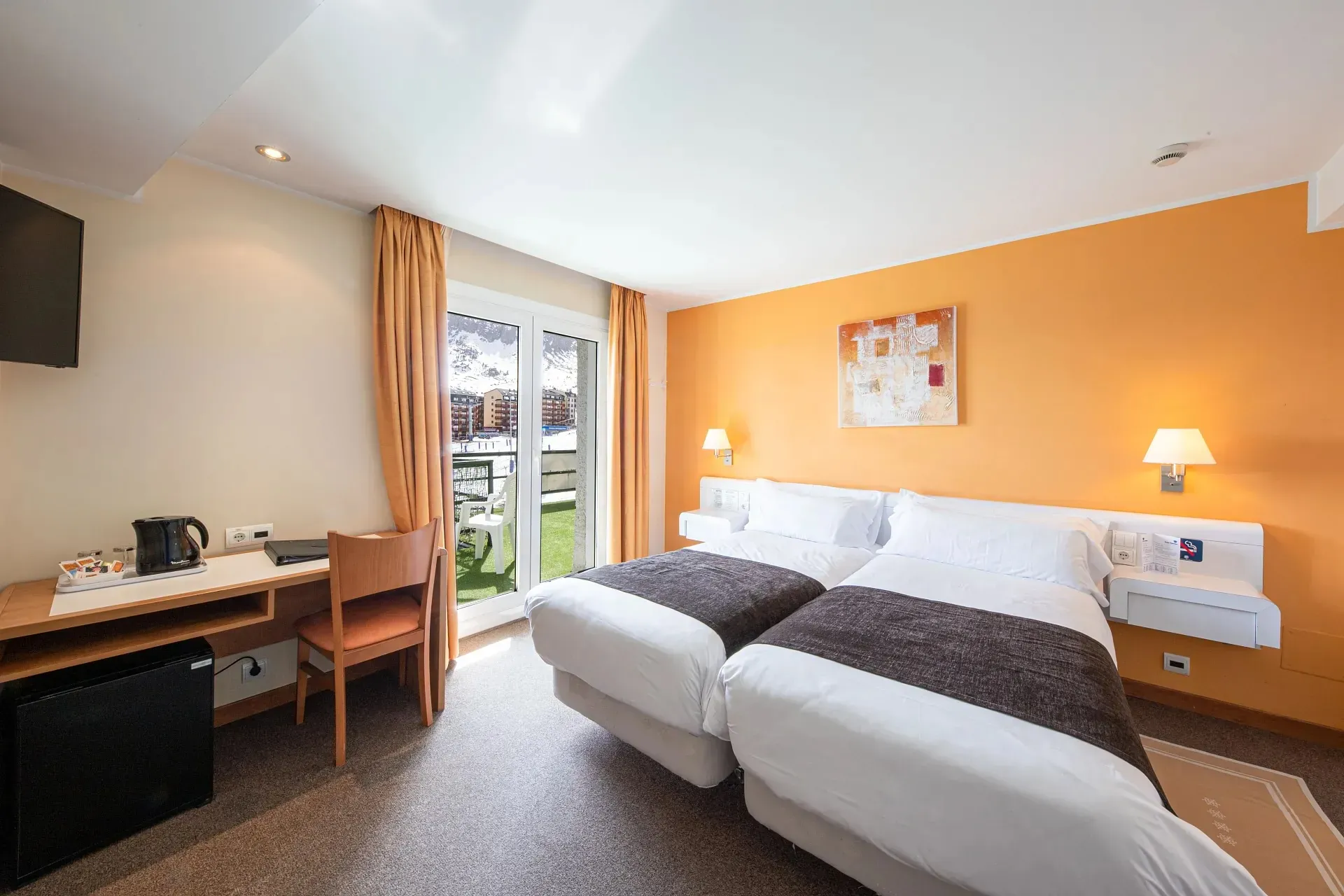 Las habitaciones, acogedoras y bien equipadas, cuentan con calefacción, baño privado, televisión vía satélite y vistas a las pistas o a la plaza del pueblo.
