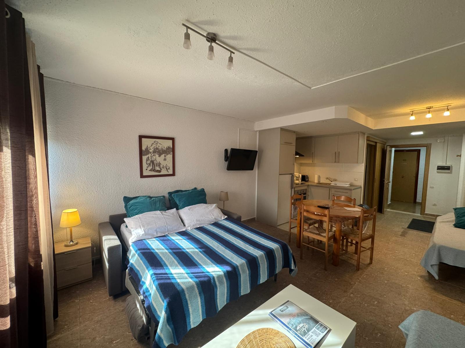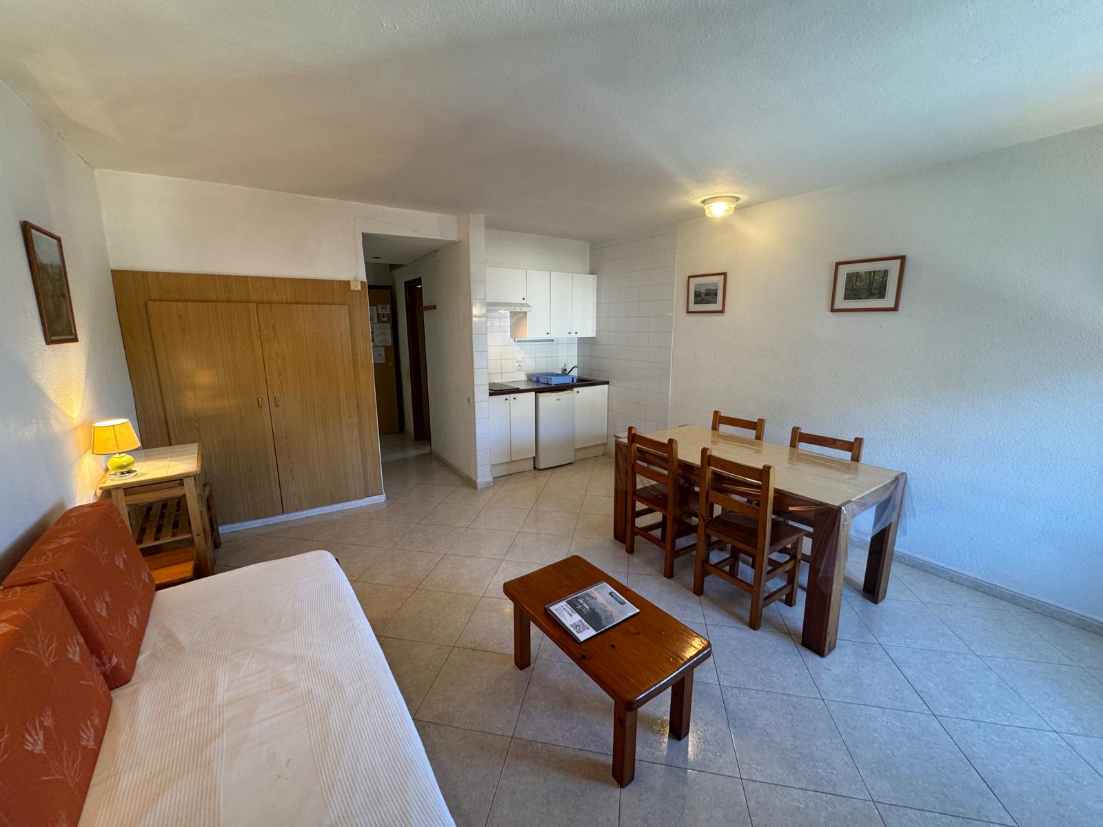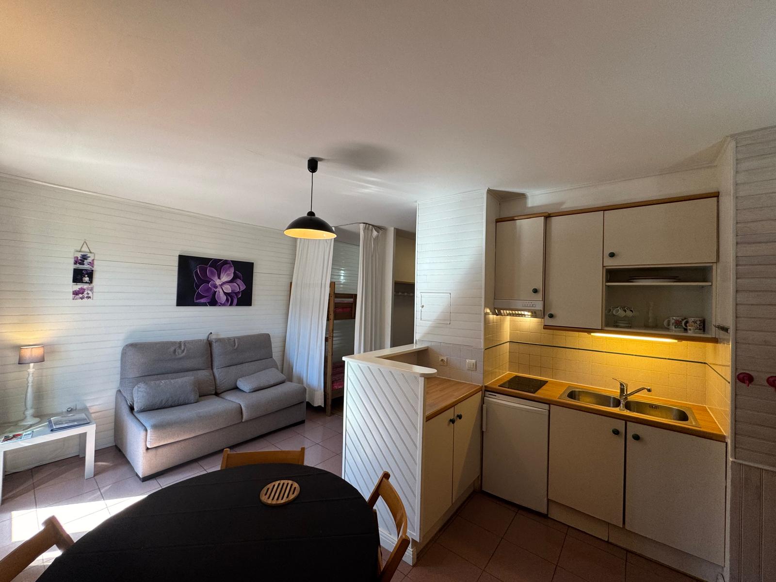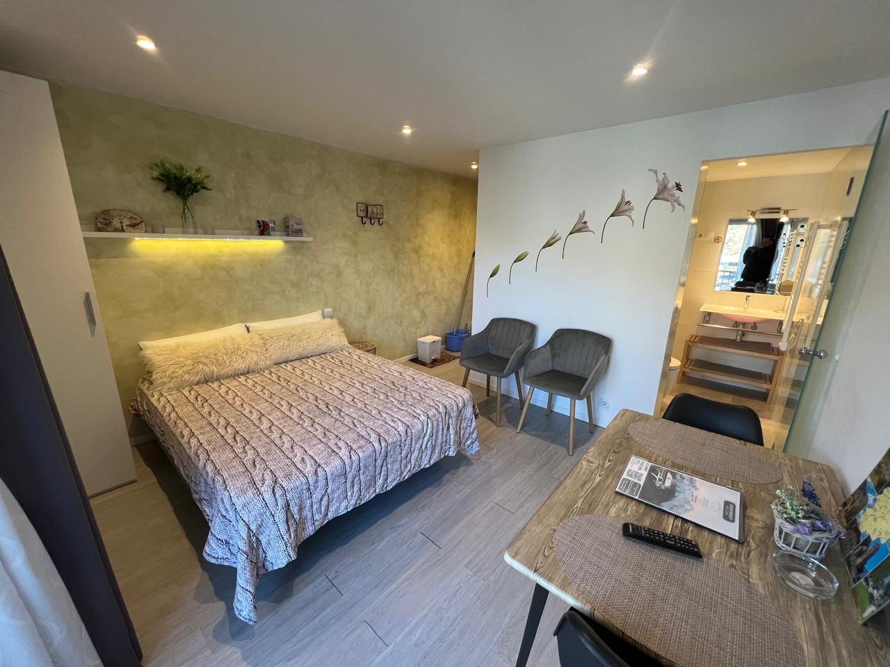 Ofrecemos estudios para 2 a 4 personas, equipados con una cocina funcional (TV de pantalla plana, nevera, placa vitrocerámica de 2 fuegos, microondas, tostadora, hervidor, exprimidor, cafetera).