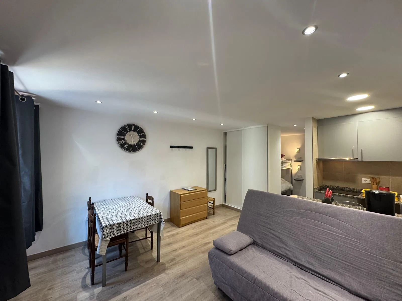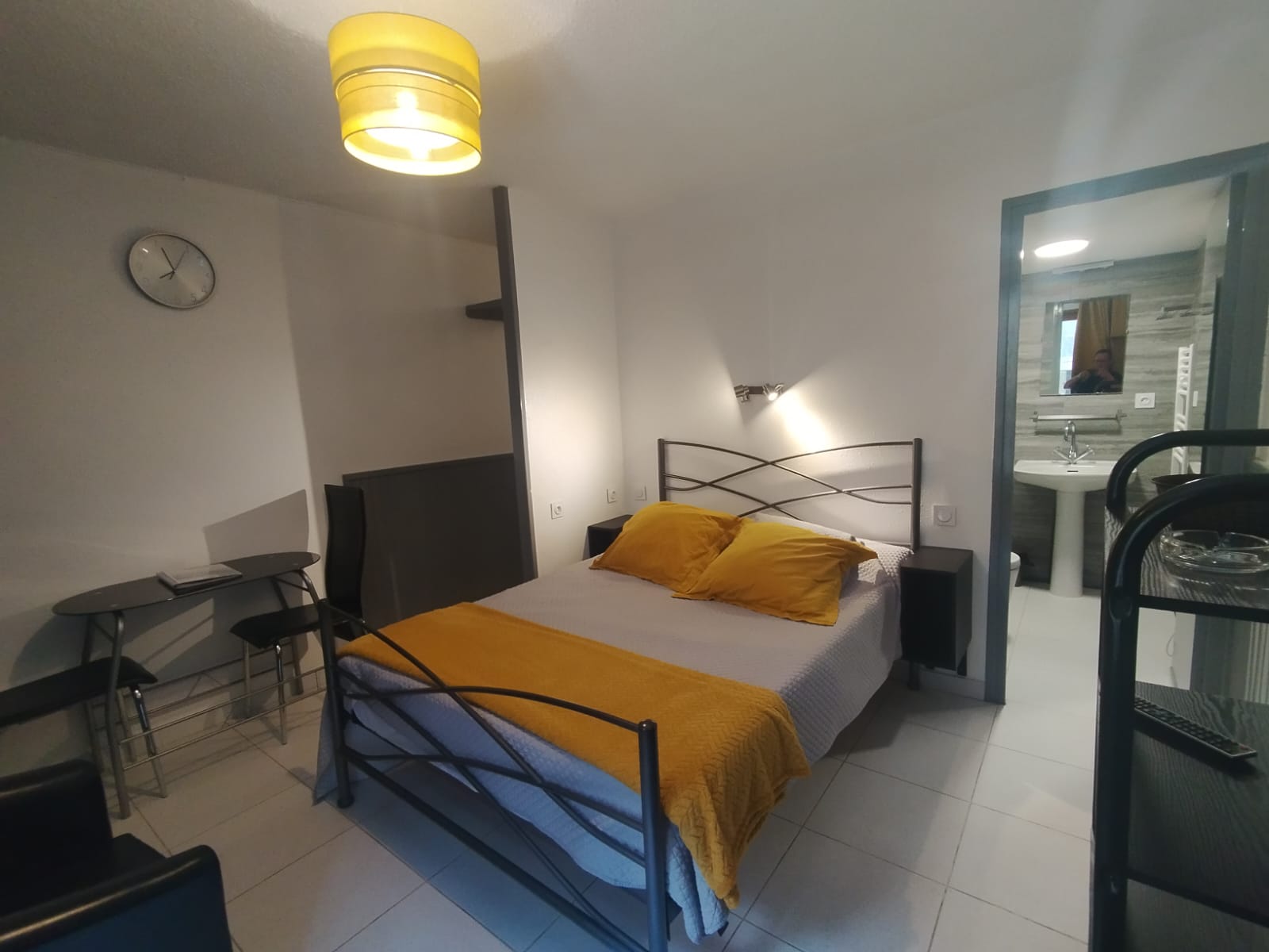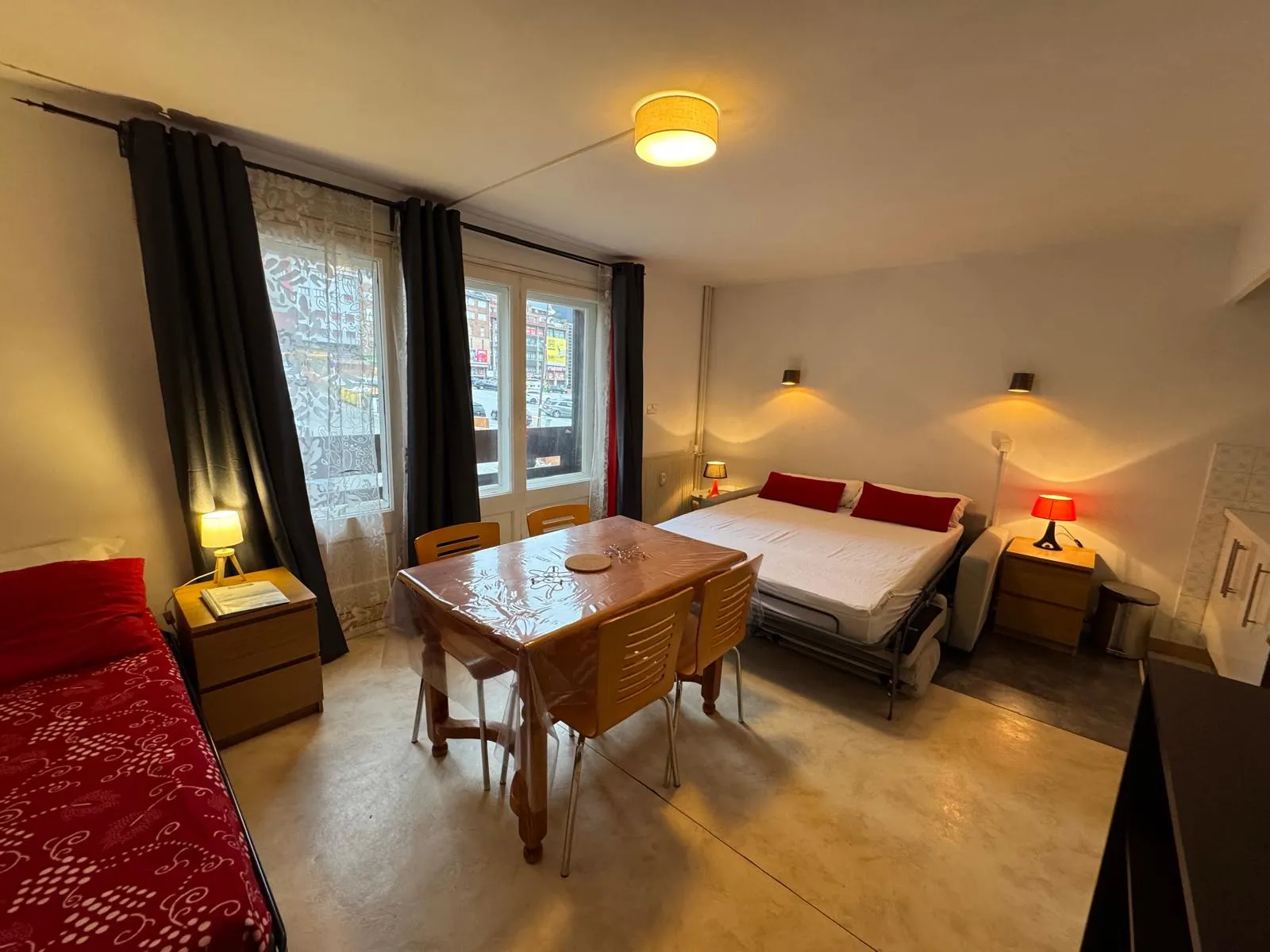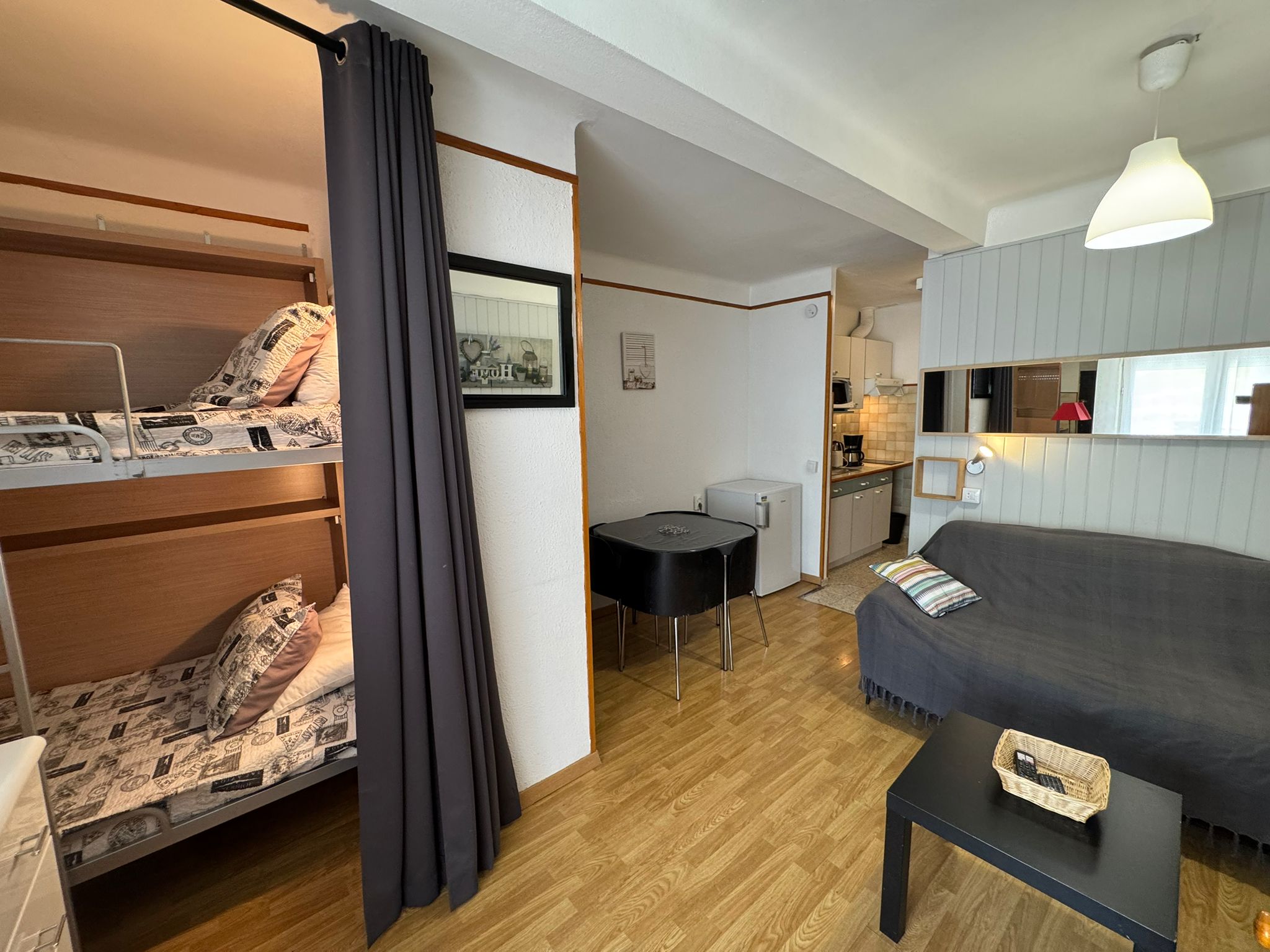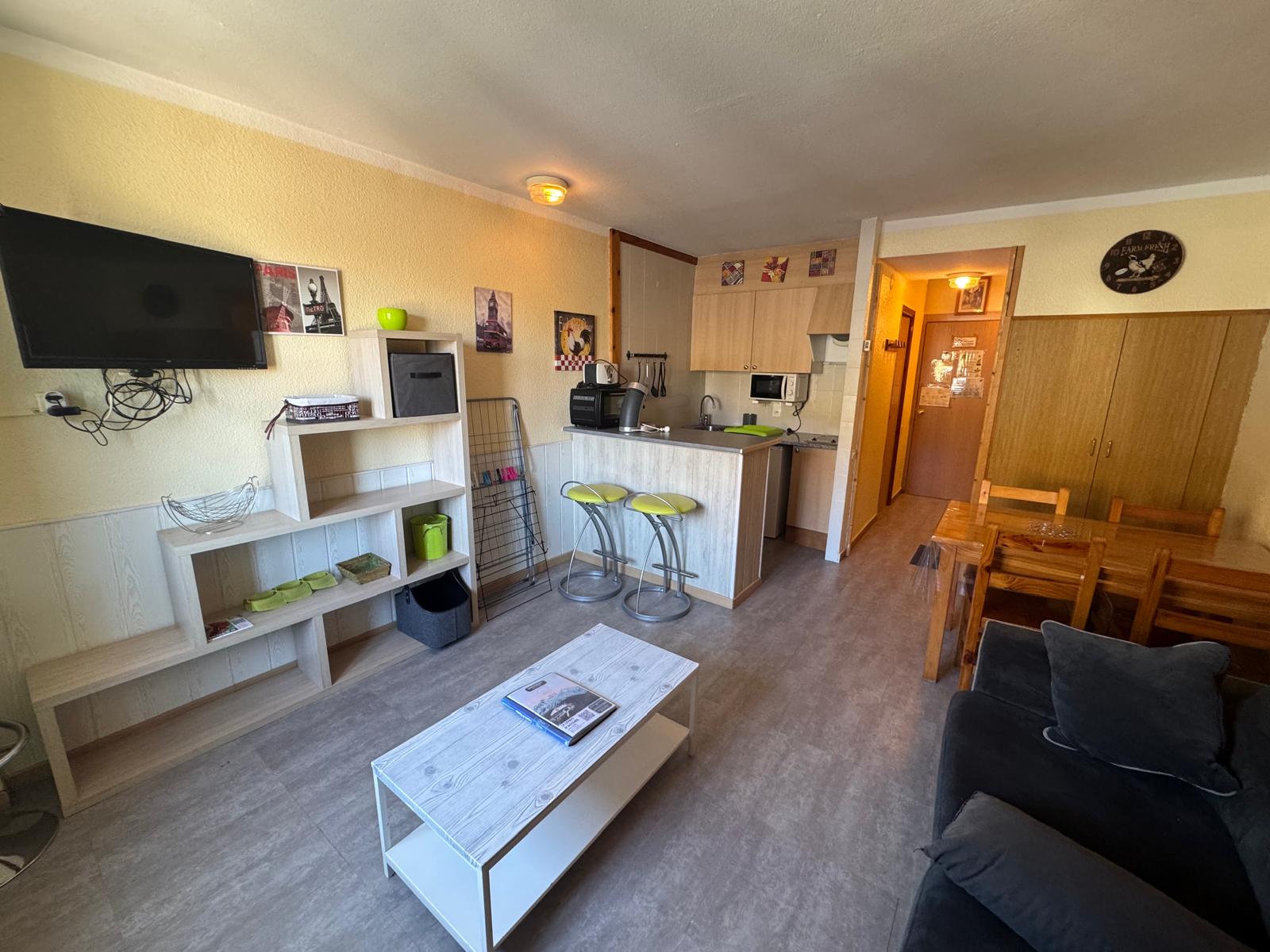 Ofrecemos estudios para 2 a 4 personas, equipados con una cocina funcional (TV de pantalla plana, nevera, placa vitrocerámica de 2 fuegos, microondas, tostadora, hervidor, exprimidor, cafetera).